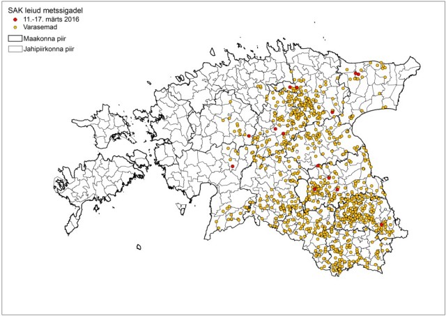 Veterinaar- ja Toiduameti andmetel diagnoositi vahemikus 15.-21.03 SAK 27 korral, kellest 5 kütiti ja 18 leiti hukkununa