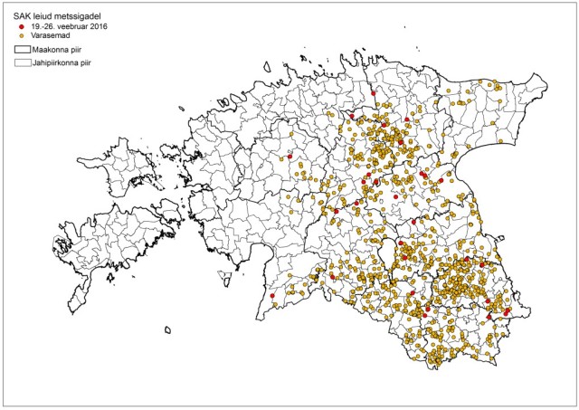 Vahemikus 23.-29.02 diagnoositi SAK 57 korral (19 hukkununa leitud ja 38 kütitud metsseal). Kokku on 2016. aastal diagnoositud SAK 460 korral.