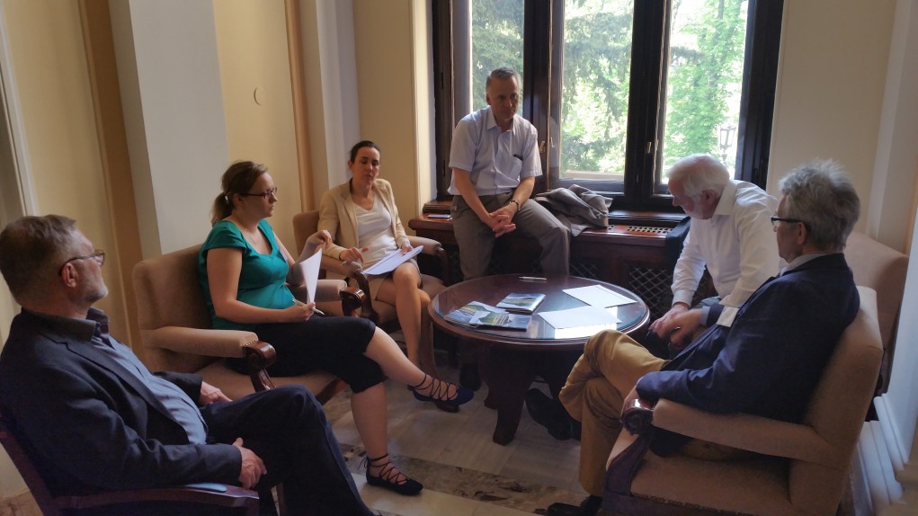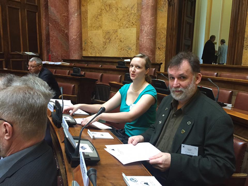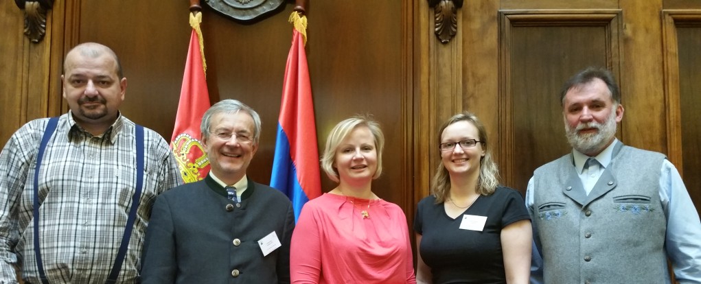 FACE aastakoosolekul Serbia parlamendihoones Belgradis, (vasakult) Serbia Jahimeeste Seltsi president Dragan Šormaz, FACE president Michl Ebner, Läti jahimeeste esindaja Linda Dombrovska, EJSi esindajad Karolin Lillemäe ja Tõnis Korts.