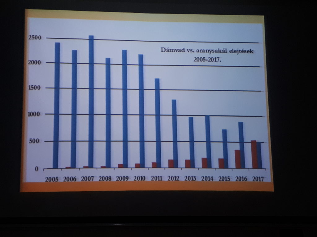Lisaks tõi Vahtramäe näite ühest Ungari riiklikust jahimajandist (48 260 ha), milline on mõju šaakalil selles jahipiirkonnas. Sinises tulbas on näha nendel jahimaadel kabehirve küttiminst 2005.‒2010. aastal, mis on keskmiselt 2300 isendit ja punases tulbas on näha šaakalite küttimist ja selle mõju. 2017. aasta kokkuvõttes kütiti šaakalit juba rohkem kui kabehirve. See on väga tõsine mõtlemiskoht, millest peaksime õppima ja kohe kiskja populatsiooni alguses ennast küttima sundima.