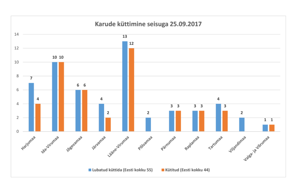 Tänaseks on Eesti jahimehed küttinud kokku 44 karu. Keskkonnaameti kehtestatud küttimismaht oli 55 isendit, seega on jäänud veel küttida 11 mesikäppa.