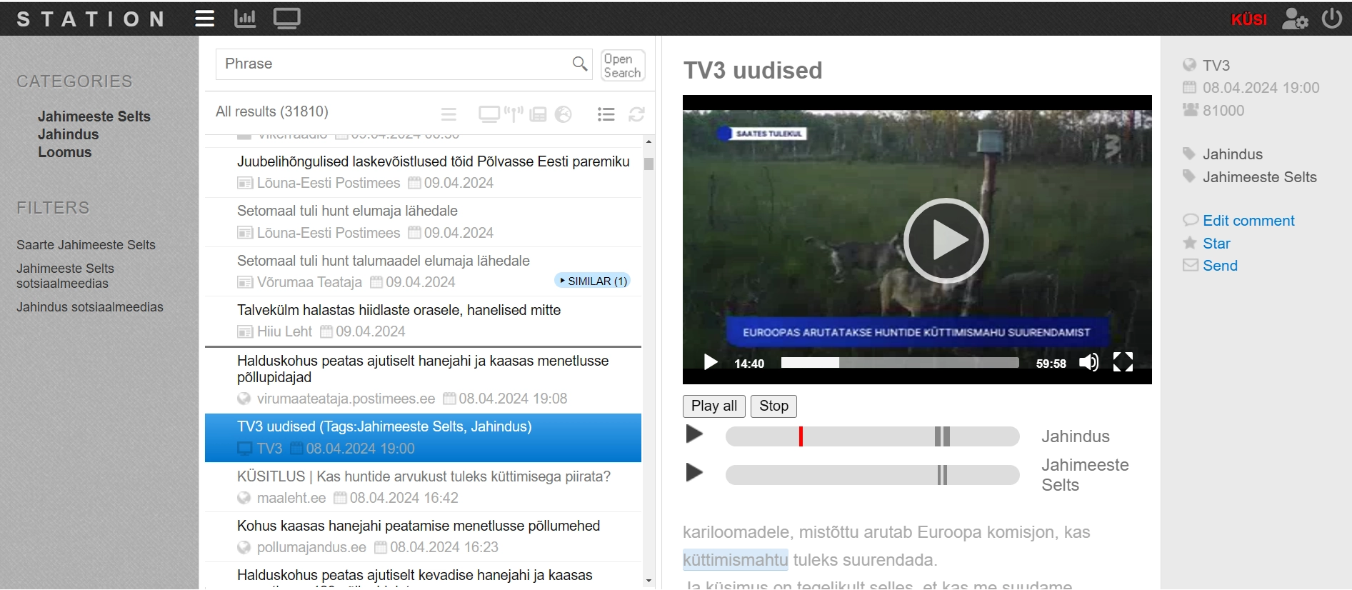 Eesti Jahimeeste Selts kasutab juba mõnda aega Stationi meediamonitooringu teenust. See võimaldab jahimeestel jälgida jahindusteemalisi uudiseid avalikes infokanalites.