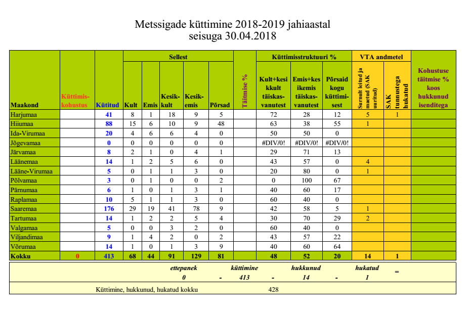 30. aprilli seisuga on Eestis jahimehed küttinud kokku 413 metssiga.