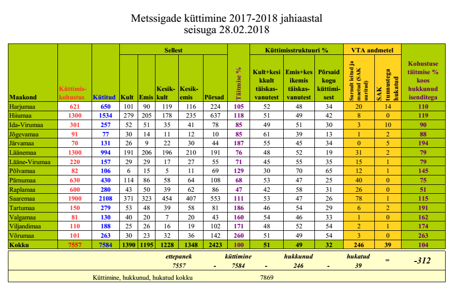 „Kui võrrelda maakondade küttimistulemusi kahe viimase jahihooaja vahel, siis on erinevused kohati märkimisväärsed: Lääne-Virumaal on metssigade küttimine sel jahihooajal sigade Aafrika katku laastamistöö tõttu langenud võrreldes mulluse hooajaga seitse korda. Samal põhjusel on metssigade küttimine vähenenud 2-5 korda ka Harju-, Ida-Viru-, Lääne-, Pärnu-, Rapla- ja Saaremaal. Etteantud küttimismahust rohkem kütiti sel hooajal metssigu Järva-, Tartu-, Valga-, Viljandi- ja Võrumaal, kus katk alustas oma laastamistööd kõige varem, ent praegune küttimismahu oodatust suurem täitmine viitab sealsele metssigade populatsiooni taastumisele. Vältimaks uusi haiguspuhanguid tuleb neis maakondades metssigade küttimismahte varasemaga võrreldes suurendada, et loodusest haigus välja tõrjuda,“ selgitas Keskkonnaameti jahinduse ja vee-elustiku büroo juhataja Aimar Rakko viimaste jahihooaegade küttimistulemuste tausta.