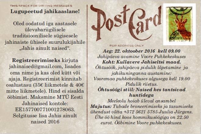 Uudised Üritused Jahis ainult naised 2016 UudisedÜritused Jahis ainult naised 2016 Lisas Toimetus - sept. 28, 2016 3109 MTÜ Eesti Jahinaised kutsuvad jahile! Segaduste vältimiseks väike täpsustus: jah, ka sellel aastal toimub kaks erinevat jahti, kuhu on oodatud naiskütid.