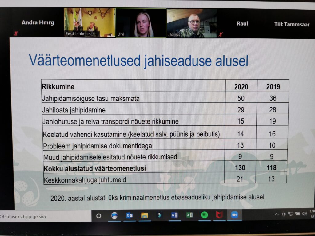 Meie koosolekul osales Keskkonnaameti (KeA) eluslooduse ja kalanduse järelevalve arendusosakonna peainspektor Liivi Plumer. Ta tegi ülevaate jahijärelevalvest. EJS-il oli võimalus anda eelnevalt sisend teemade kohta, mis meid huvitavad. Liivi tutvustas, millised olid jahiseaduse alusel väärteomenetlused eelmisel aastal menetletud. Kokku alustati 130 väärteomenetlust. 2019. aastal oli see arv 118. Kõige rohkem oli jahipidamise õiguse maksmata jätmisi, neid fikseeriti 50. Teisel kohal oli jahiloata jahipidamine 29. Kolmandal kohal olid jahiohutuse ja relva transpordi nõuete rikkumine 15 korral. Sinna kuuluvad nt hoonetele liiga lähedal küttimised, poolautomaatsetel salvede kasutamine, kuhu mahub rohkem kui 2 padrunit. Probleemid jahipidamise dokumentidega oli 13 menetlust.