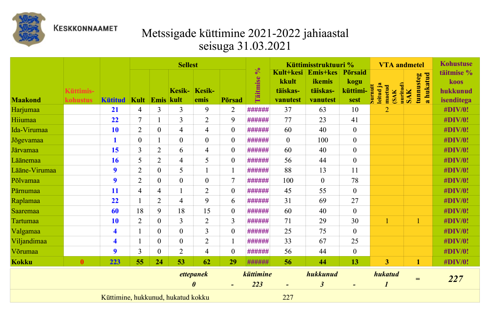 Märtsis kütiti Eestis kokku 223 metssiga. Lisaks leiti surnult 3 ja hukati SAK tunnustega 1 metssiga.