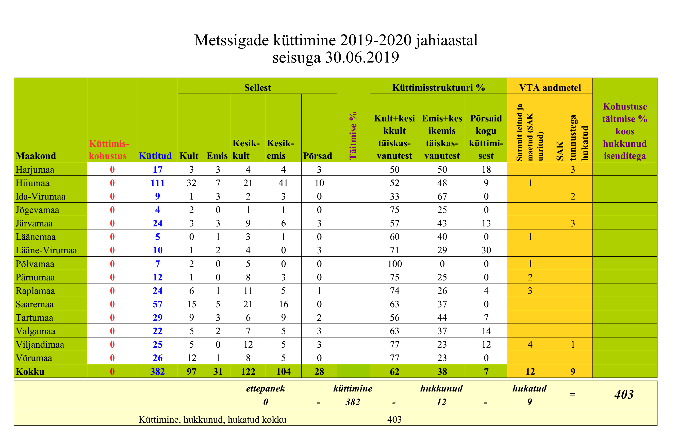 Juuni lõpu seisuga on jahimehed Eestis küttinud 382 metssiga. Juunis kütiti kokku 147 metssiga. Lisaks on surnult leitud ja maetud 12 ning seakatku tunnustega hukatud 9 isendit.