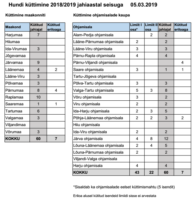 Võru, Põhja- ja Lõuna-Läänemaa ohjamisaladel jäi küttimismaht täitmata ühe isendi võrra. Saaremaal kestab hundijaht jahieeskirja järgi märtsi lõpuni ja seal tohib küttida veel kaks looma.
