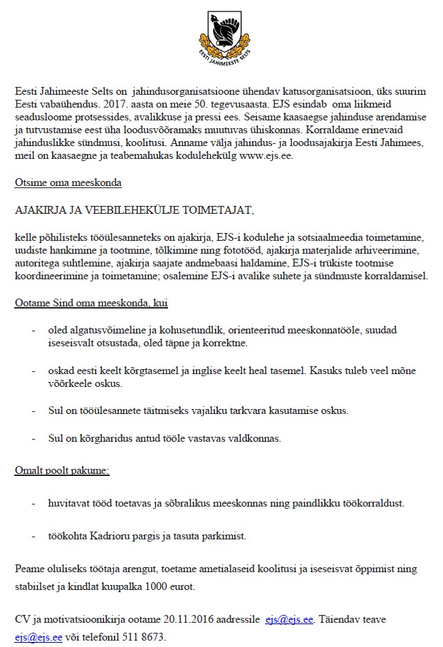 Uudised Teated Otsime oma meeskonda ajakirja ja veebitoimetajat UudisedTeated Otsime oma meeskonda ajakirja ja veebitoimetajat Lisas Toimetus - nov. 3, 2016 2886 Seoses eelmise toimetaja suundumisega uuele töökohale, otsime oma meeskonda ajakirja ja veebitoimetajat. Töökuulutuse leiate SIIT
