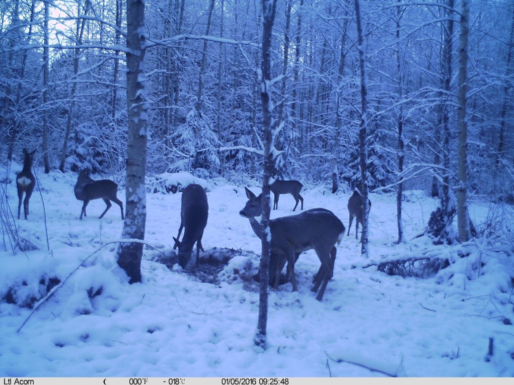 Priit Vahtramäe edastas rajakaamera foto metskitsedest söödaplatsil koos kommentaariga: “Mõistliku küttimise juures jääb alati järekasvu.”