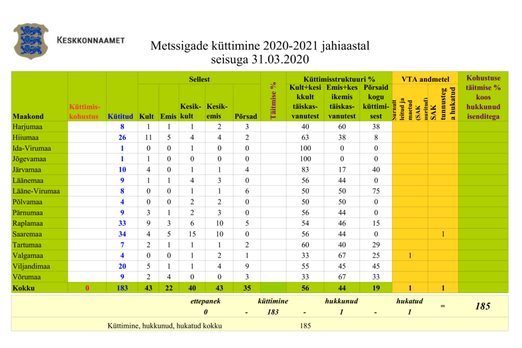 Uuel jahihooajal on jahimehed küttinud Eestis kokku 183 metssiga. Lisaks on surnult leitud üks isend ja SAK tunnustega hukatud samuti üks isend.