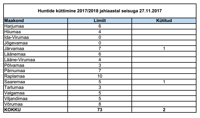 27. novembri seisuga on sel jahihooajal Eestis kütitud kaks hunti.