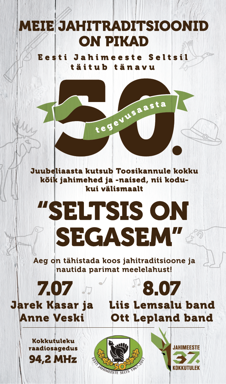 Eesti Jahimeeste Seltsil täitub tänavu 50. tegevusaasta ning suvise jahimeeste kokkutuleku puhuks valmis üritust tutvustav plakat.