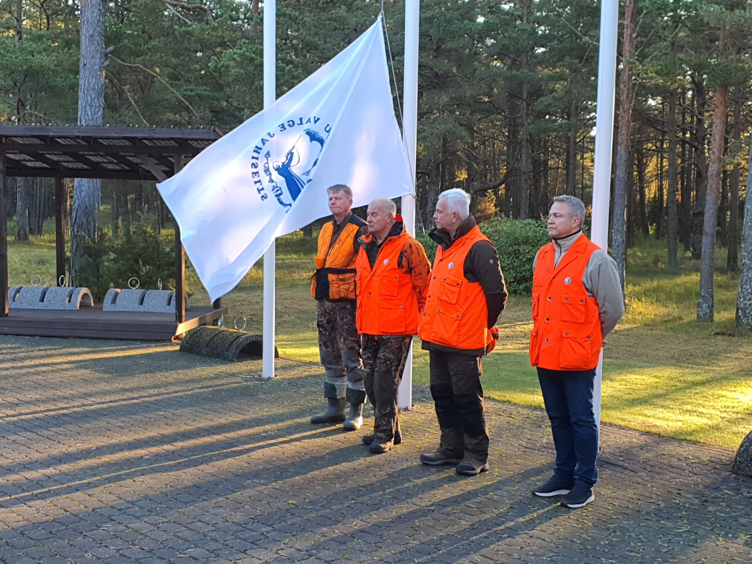 Lipu heiskamine. Vasakult: jahijuhataja Neeme Sepp Laugi jahiseltsist, küttide vanem Uno Vait Viru valge jahiseltsist ja Jüri Käo ja Janek Kalvi viru valge jahiseltsist. Foto: EJS